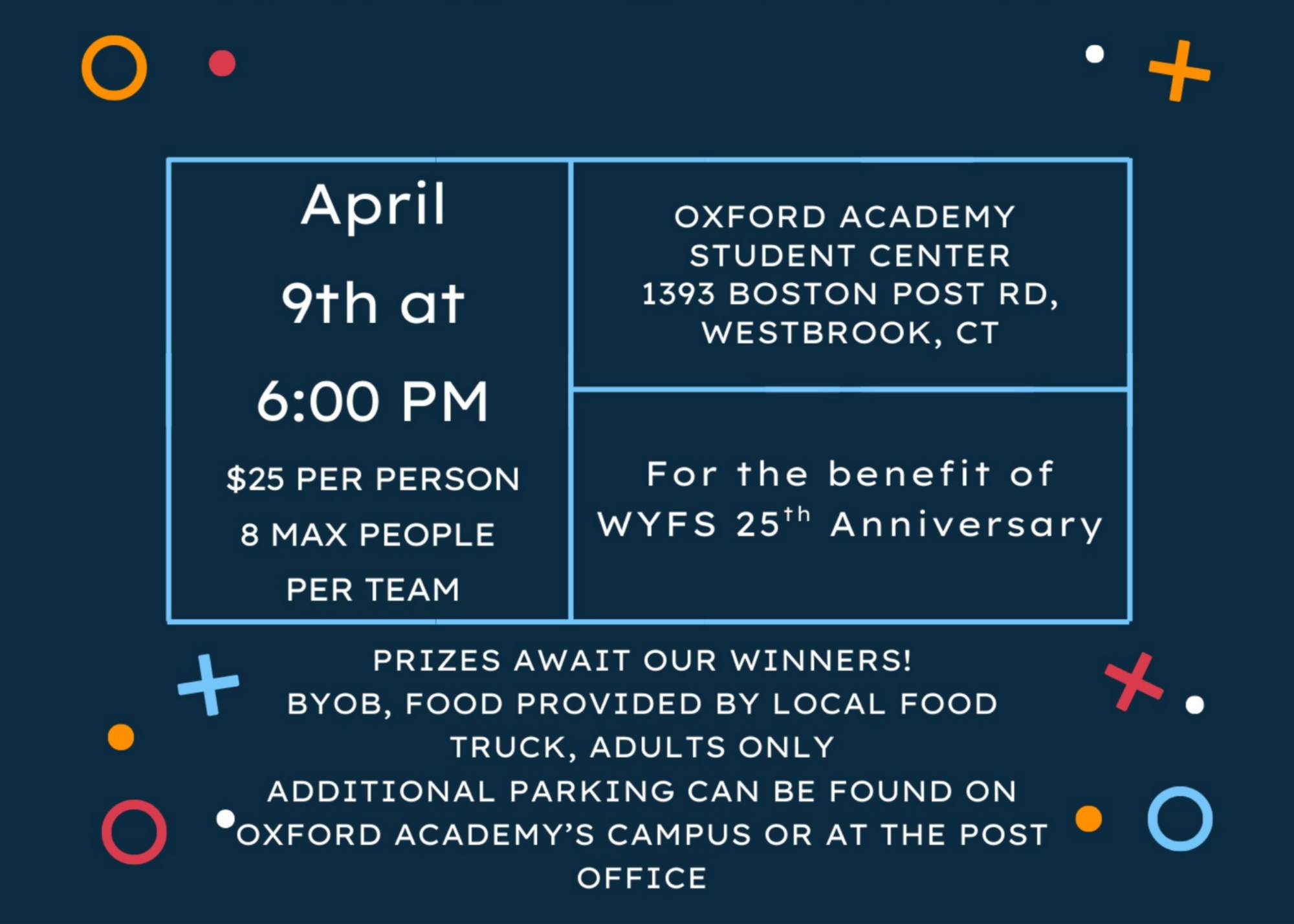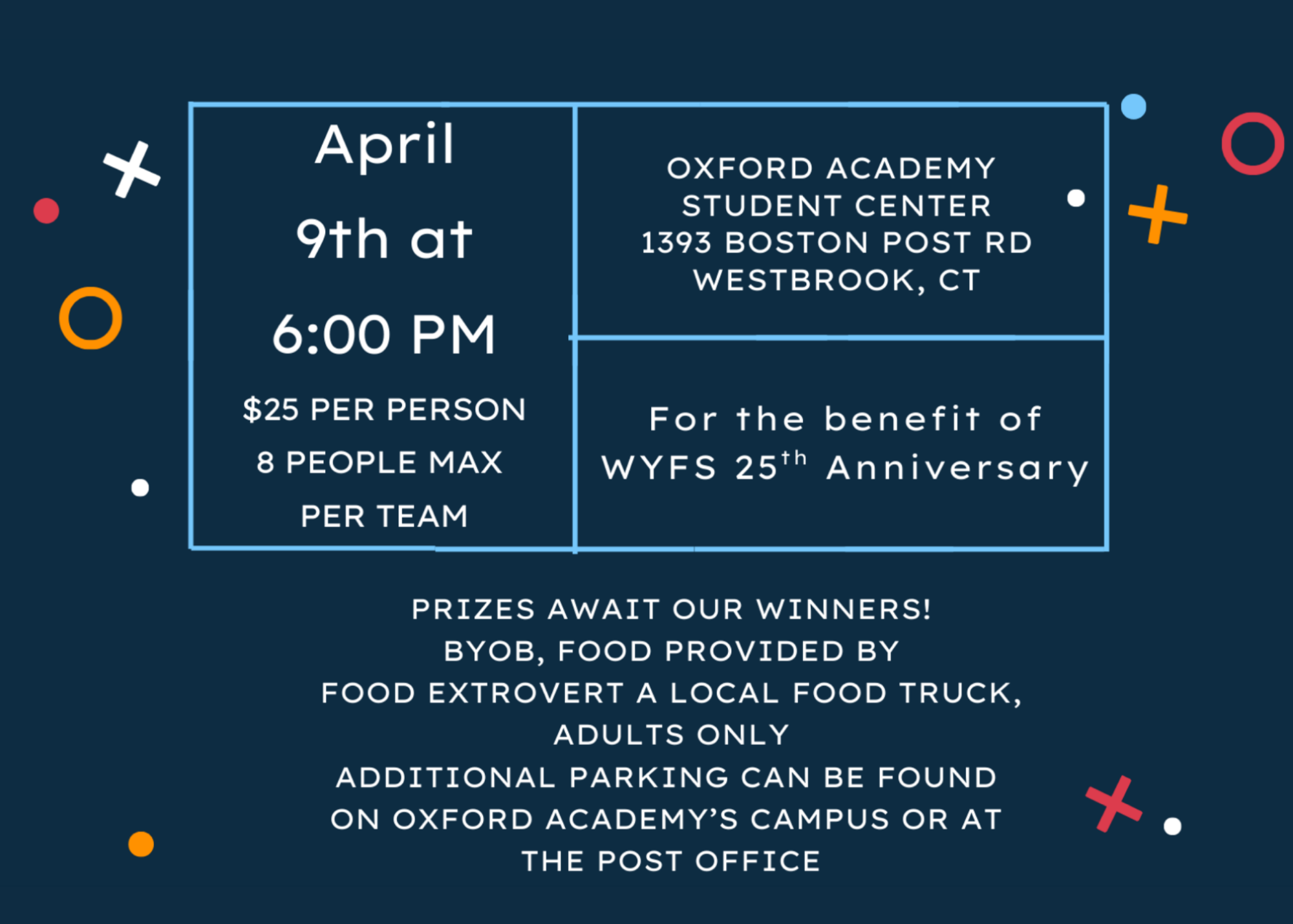 Purchase individually or for your group for a donation of $25 per person. Trivia teams can have up to 8 members.